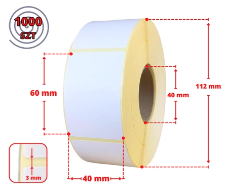 Etykiety termiczne samoprzylepne o wymiarze 40 x 60 mm, przeznaczone do drukarek termicznych, zadruk nie wymaga użycia kalek barwiących.
