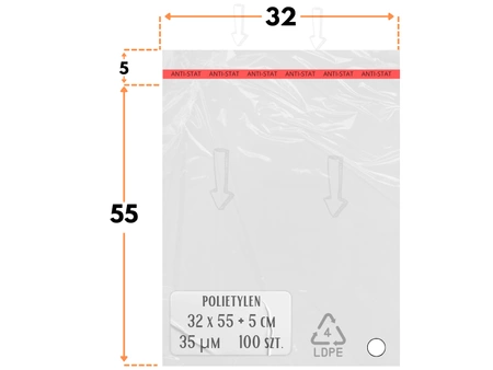 Torebki foliowe na ubrania szerokości 32 cm i długości 55 cm + zakładka 5 cm z taśmą klejącą.