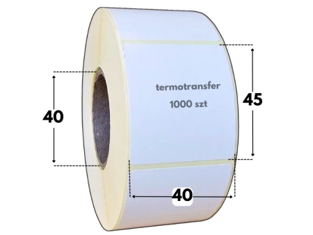 Białe etykiety samoprzylepne termotransferowe szerokości 40 mm i długości 45 mm. Jednorzędowe nawinięte na roli z gilzą 40 mm, w ilości 1000 sztuk.