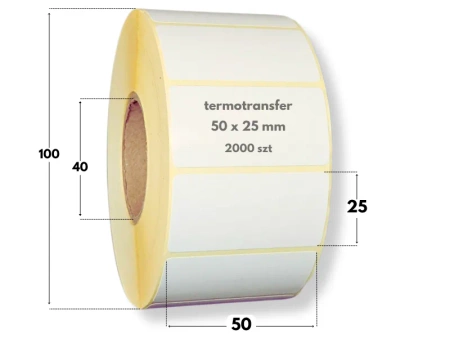 Białe etykiety samoprzylepne termotransferowe szerokości 50 mm i długości 25 mm. Jednorzędowe nawinięte na roli z gilzą 40 mm, w ilości 2000 sztuk.
