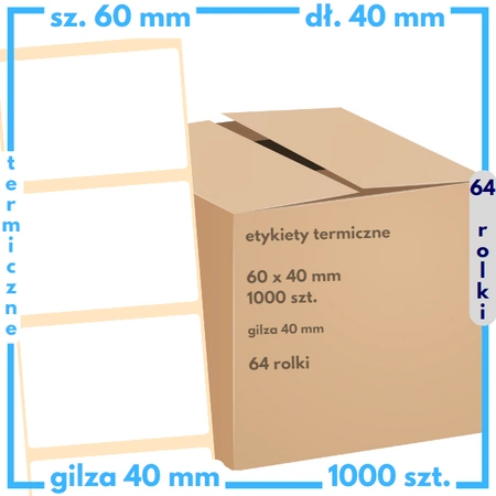 Etykiety termiczne samoprzylepne o wymiarze 60 x 40 mm, przeznaczone do drukarek termicznych, zadruk nie wymaga użycia kalek barwiących.