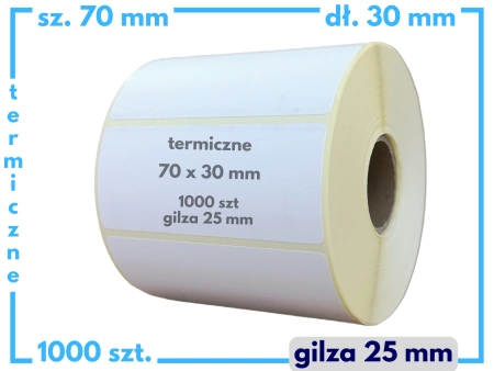 Etykiety termiczne samoprzylepne o wymiarze 70 x 30 mm, przeznaczone do drukarek termicznych, zadruk nie wymaga użycia kalek barwiących.