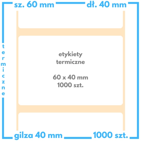 Etykiety termiczne samoprzylepne o wymiarze 60 x 40 mm, przeznaczone do drukarek termicznych, zadruk nie wymaga użycia kalek barwiących.