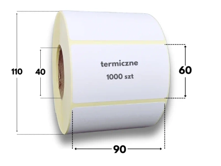 Etykiety termiczne samoprzylepne o wymiarze 90 x 60 mm, przeznaczone do drukarek termicznych, zadruk nie wymaga użycia kalek barwiących.
