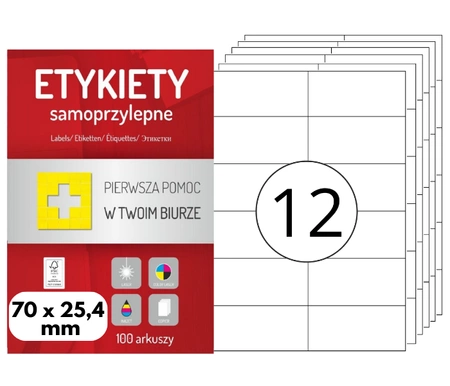 Oferowany produkt zawiera 12 etykiet na 1 arkuszu. Charakteryzują się wysoką jakością papieru, dzięki czemu są odpowiednie do druku laserowego, cyfrowego oraz do kopiarek. Bardzo dobrze przylegają do powierzchni, a specjalnie dobrany klej jest odporny na działanie wysokich temperatur