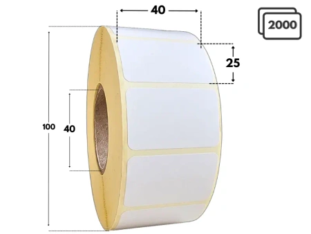 Białe etykiety samoprzylepne termotransferowe szerokości 40 mm i długości 25 mm. Jednorzędowe nawinięte na roli z gilzą 40 mm, w ilości 2000 sztuk.