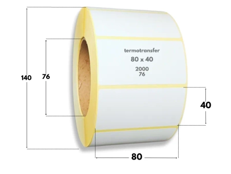 Białe etykiety samoprzylepne termotransferowe szerokości 80 mm i długości 40 mm. Jednorzędowe nawinięte na roli z gilzą 76 mm, w ilości 2000 sztuk.