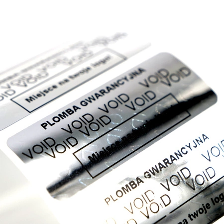 - Plomby gwarancyjne VOID srebrne o wymiarze 45 na 18 mm z czarnym indywidualnym nadrukiem.