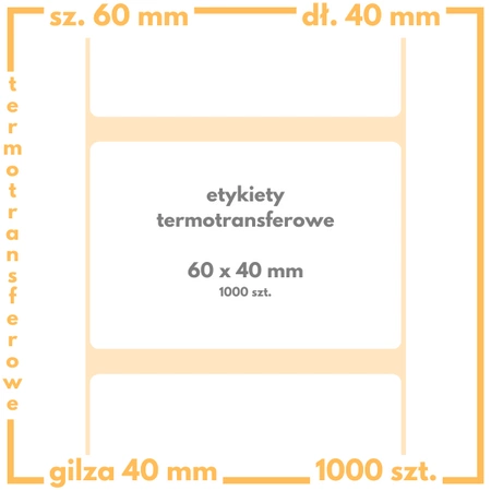 Białe etykiety samoprzylepne termotransferowe szerokości 60 mm i długości 40 mm. Jednorzędowe nawinięte na roli z gilzą 40 mm, w ilości 1000 sztuk.