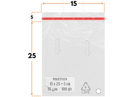 Torebki foliowe na ubrania szerokości 15 cm i długości 25 cm + zakładka 5 cm z taśmą klejącą.