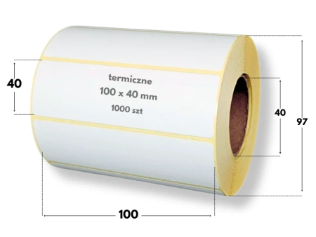 Etykiety termiczne samoprzylepne o wymiarze 100 x 40 mm, przeznaczone do drukarek termicznych, zadruk nie wymaga użycia kalek barwiących.