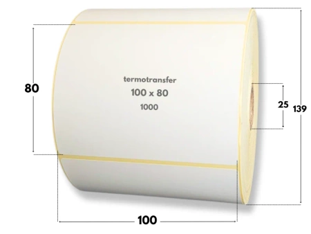 Białe etykiety samoprzylepne termotransferowe szerokości 100 mm i długości 80 mm. Jednorzędowe nawinięte na roli z gilzą 25 mm, w ilości 1000 sztuk.