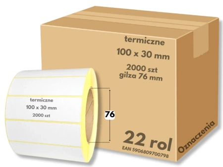 Etykiety termiczne samoprzylepne o wymiarze 100 x 30 mm, przeznaczone do drukarek termicznych, zadruk nie wymaga użycia kalek barwiących.