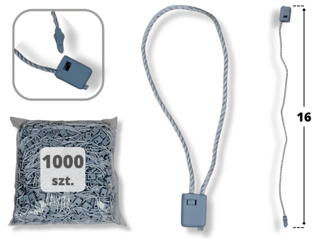 Sznurkowe łączniki w kolorze GRAFITOWYM, do ręcznego mocowania etykiet kartonowych.