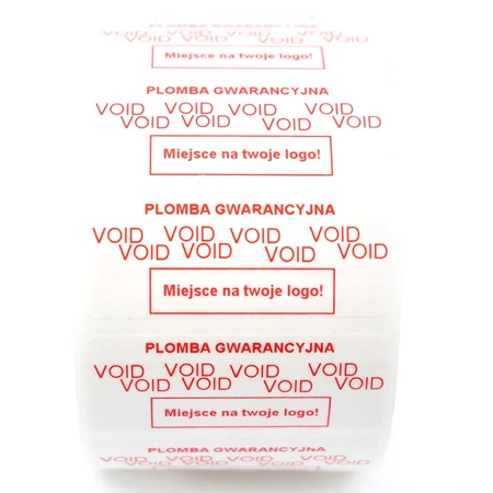 - Plomby gwarancyjne VOID białe o wymiarze 45 na 18 mm z czerwonym indywidualnym nadrukiem.