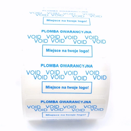 - Plomby gwarancyjne VOID białe o wymiarze 45 na 18 mm z niebieskim indywidualnym nadrukiem.