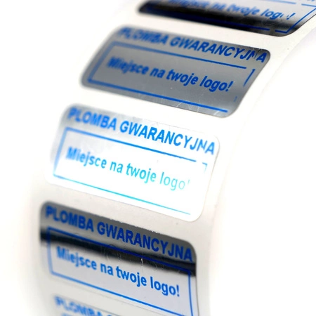 - Plomby gwarancyjne VOID srebrne o wymiarze 30 na 11 mm z niebieskim indywidualnym nadrukiem.