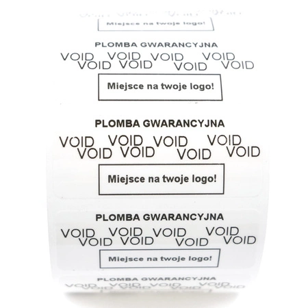 - Plomby gwarancyjne VOID białe o wymiarze 45 na 18 mm z czarnym indywidualnym nadrukiem.